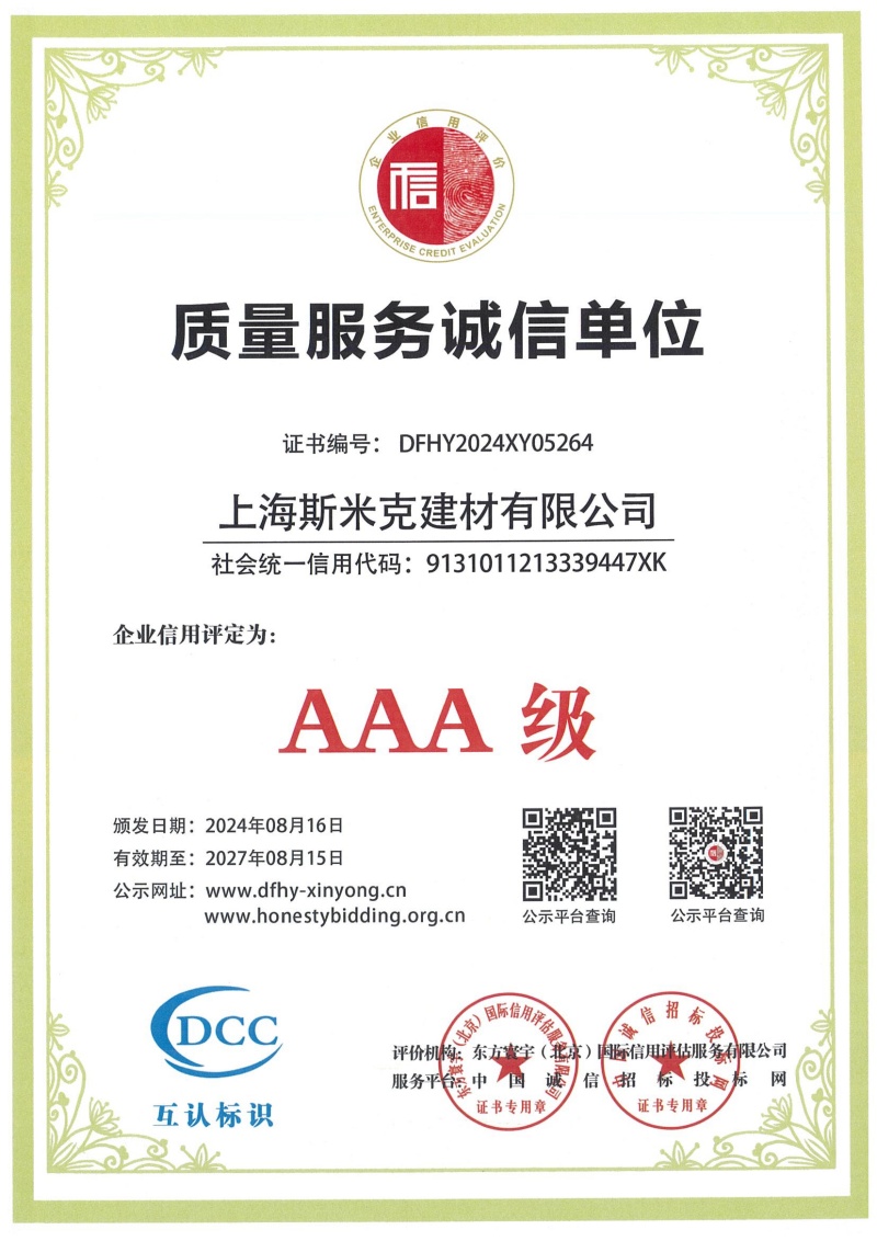 獲三公國際資信評估《誠信經營示範企業》AAA級(有效期至2024/8/15) 獲三公國際資信評估《重質量守信用信企業》AAA級(有效期至2024/8/15)